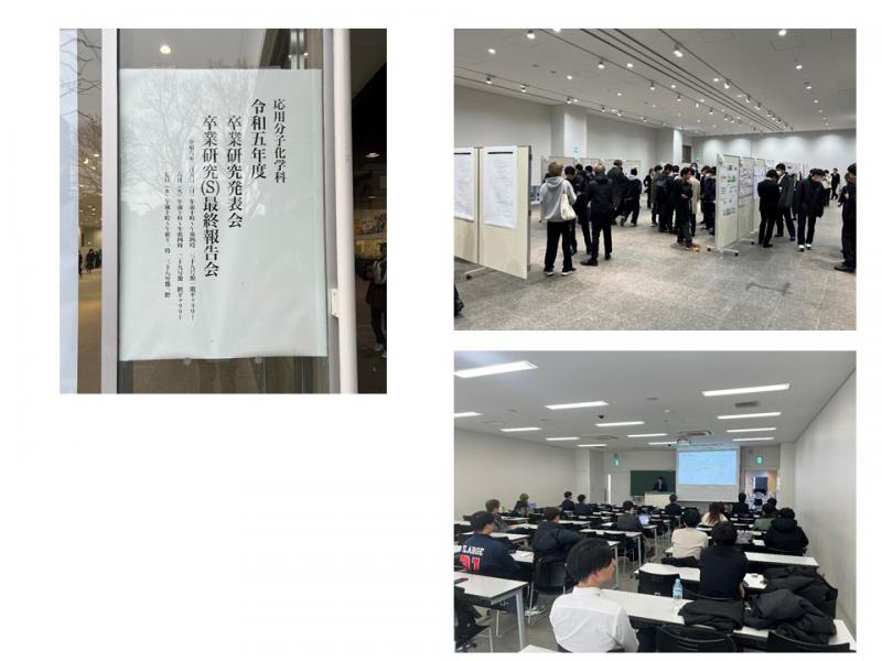 令和5年度応用分子化学科の卒業研究発表会および卒業研究(S)最終報告会が2月6日(月)~2月7日(水)まで行われました。 卒業研究対象者はポスター発表で、卒業研究(S)対象者は口頭発表での発表会となりました。 4年生にとっては学生生活最後の1年間の取り組みの成果を発表する機会となりました。 いずれの日程においても活発な意見交換が行われました。