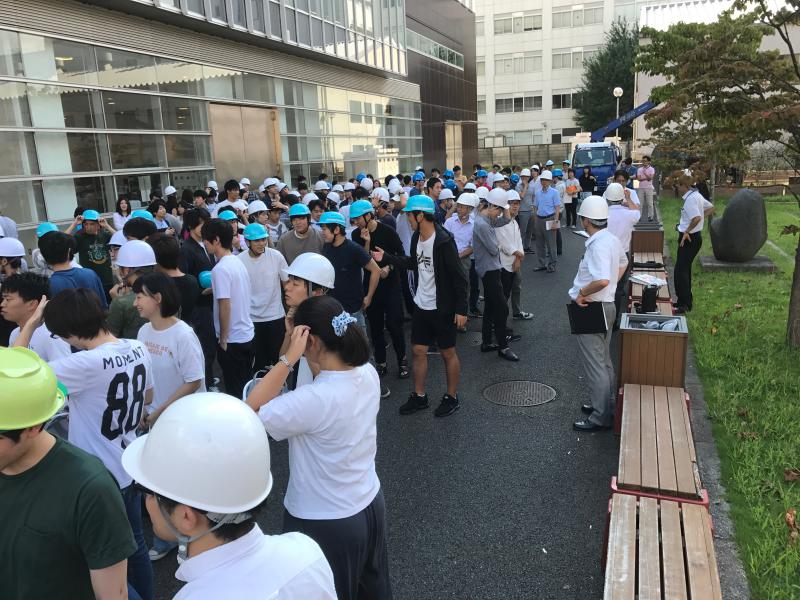 平成29年9月14日(木)に応用分子化学科の教職員ならびに学部学生,大学院生,そして研究生を対象に学科主催の避難訓練を実施しました。今年は天候にも恵まれ,屋外に設定した避難場所への退避が行われました。